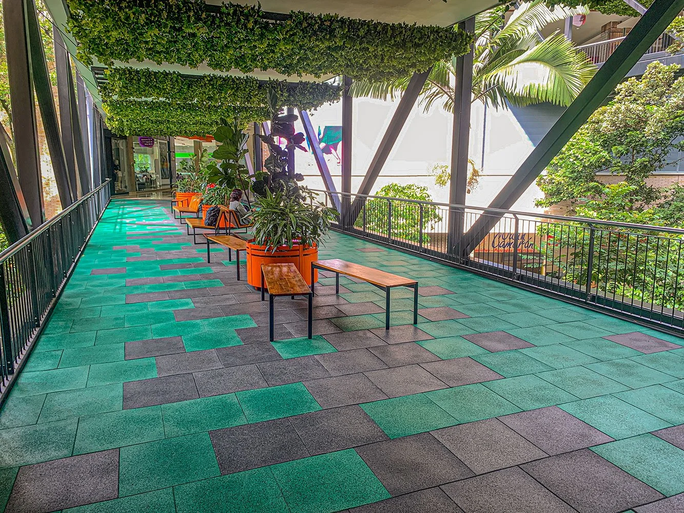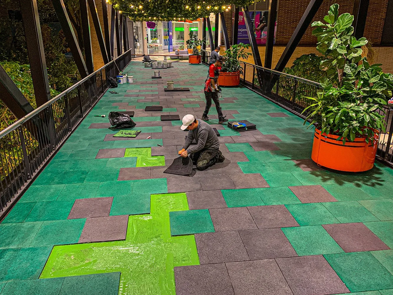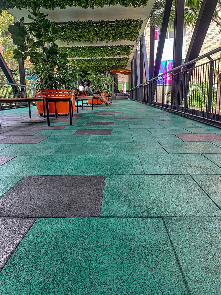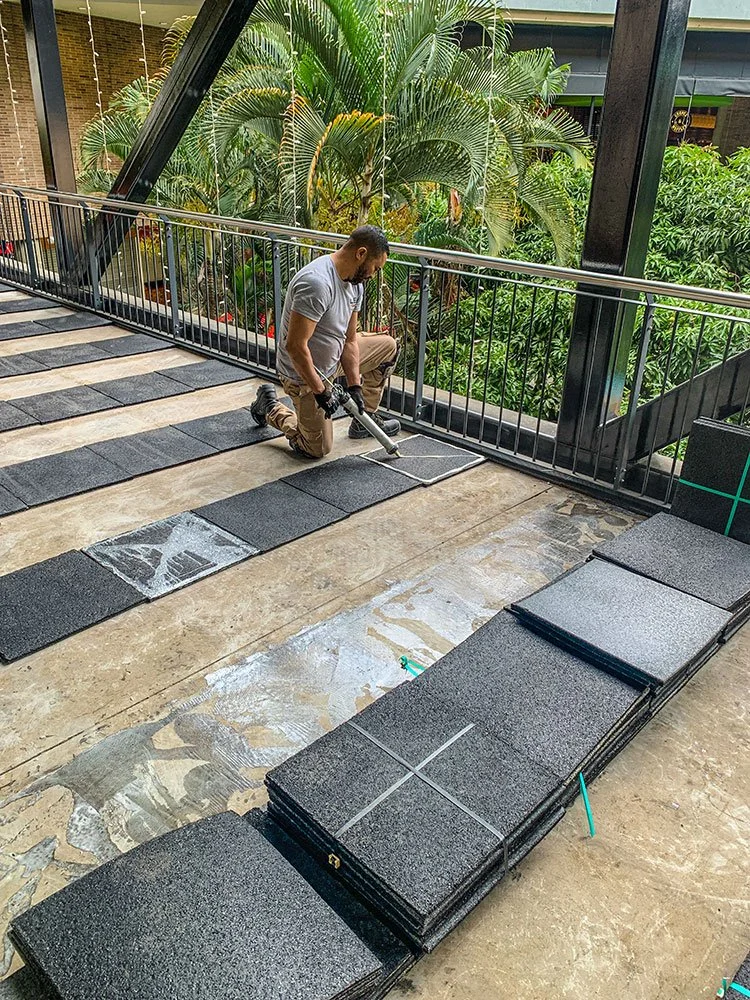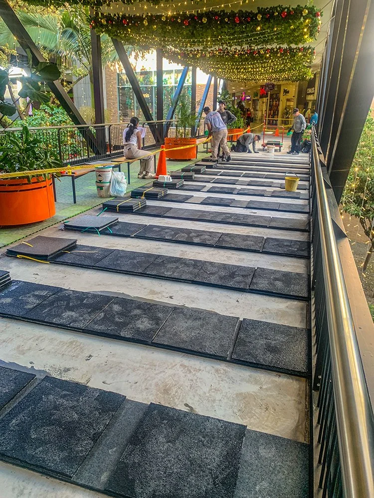 Para la Comercializadora Calipso, realizamos la instalación de baldosas Flex con acabado EPDM en los puentes peatonales de alto tráfico del Centro Comercial La Florida en Medellín. Estas baldosas, fabricadas en EPDM, resisten el alto tránsito peatonal y las condiciones externas, mientras que el diseño y los colores personalizados realzan la estética de los puentes, brindando un acabado moderno y duradero.