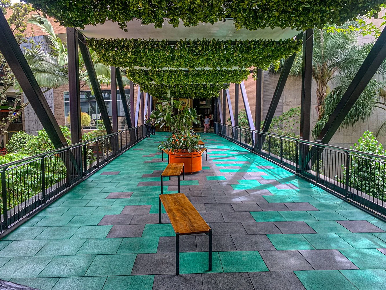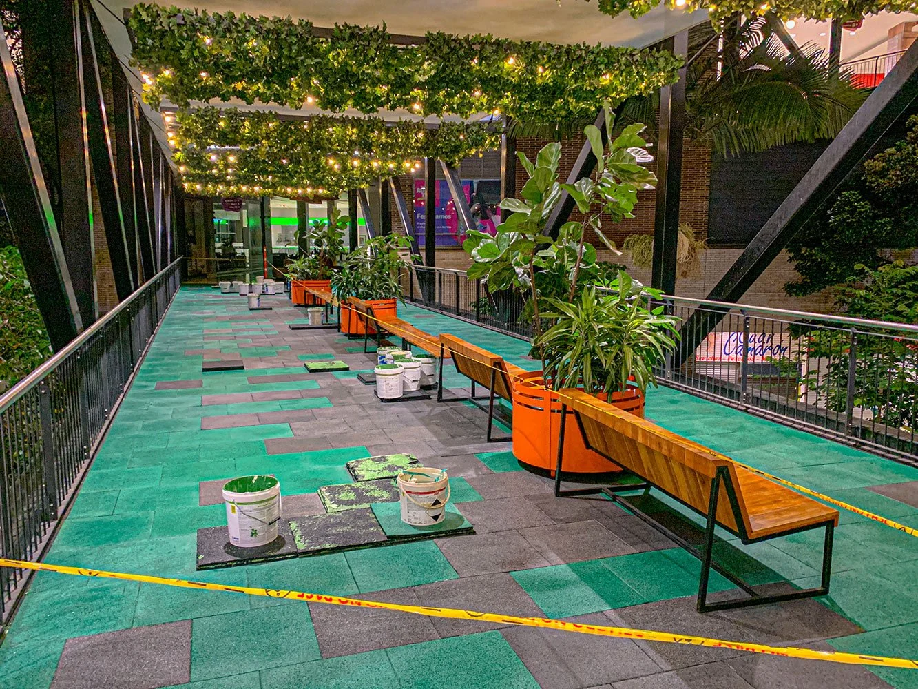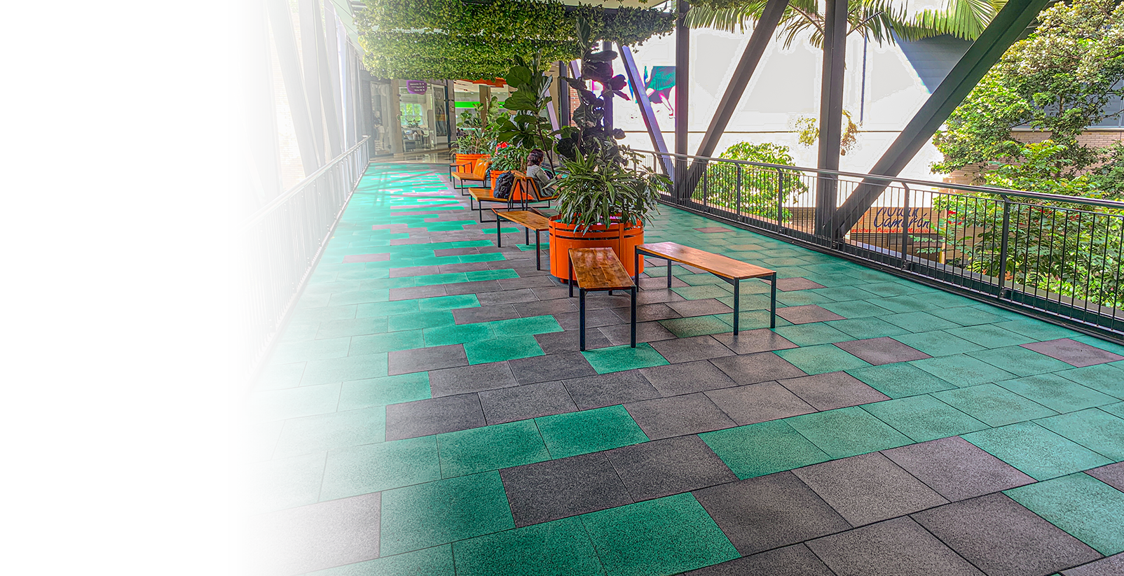 Para la Comercializadora Calipso, realizamos la instalación de baldosas Flex con acabado EPDM en los puentes peatonales de alto tráfico del Centro Comercial La Florida en Medellín. Estas baldosas, fabricadas en EPDM, resisten el alto tránsito peatonal y las condiciones externas, mientras que el diseño y los colores personalizados realzan la estética de los puentes, brindando un acabado moderno y duradero.